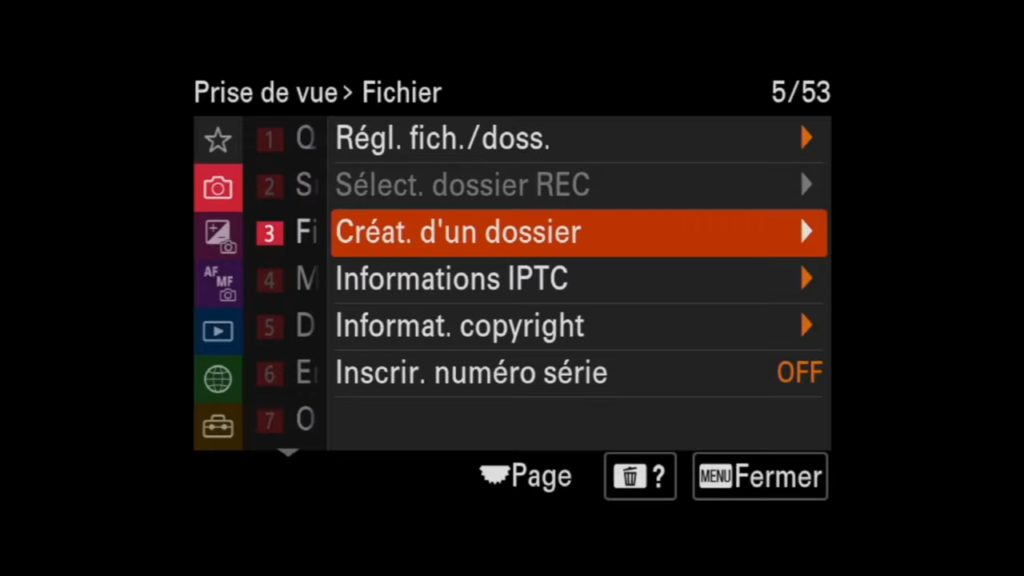 Tu peux choisir entre deux options : « Standard » ou « Date ». En sélectionnant « Date », l’appareil crée un nouveau dossier chaque jour où des photos sont prises. Personnellement, je laisse généralement l’option sur « Standard », mais si tu as une commande ou un projet qui dure plusieurs jours, l’option « Date » peut être très pratique pour organiser tes fichiers ultérieurement. Je pense l’utiliser davantage à l’avenir pour mieux gérer mes photos sur des projets à long terme.