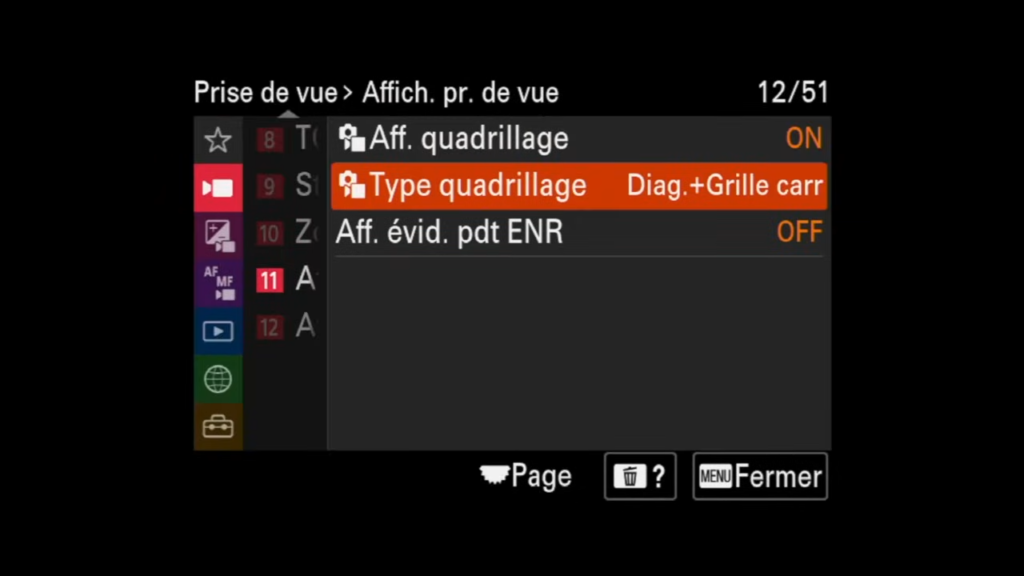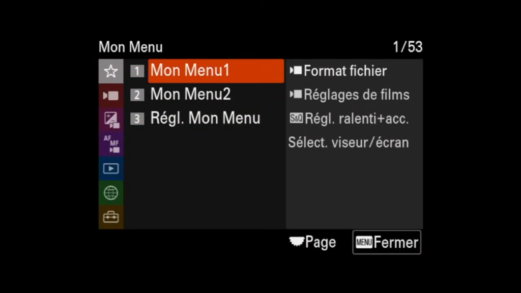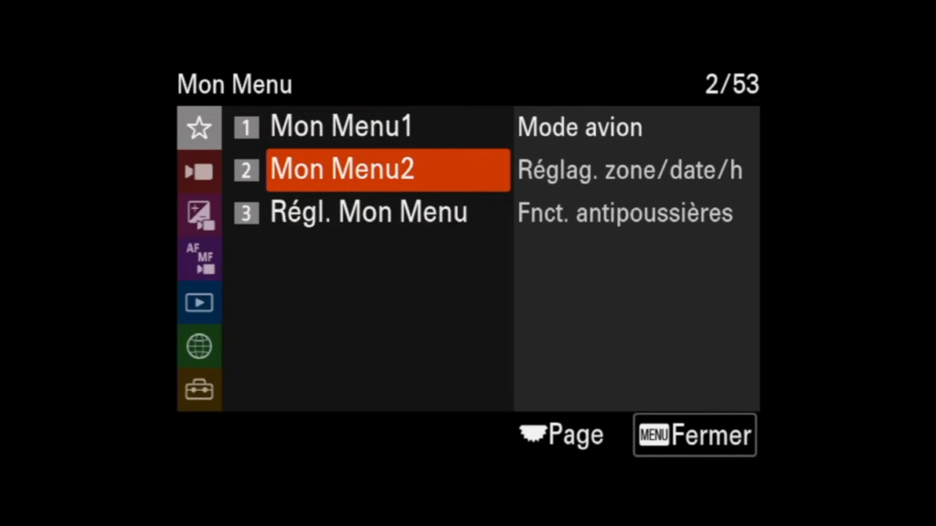 Pour finir, je te partage les éléments que j’ai enregistré dans Mon Menu 1 et Mon Menu 2. Ils me permettent d’y accéder rapidement, sans avoir à parcourir l’ensemble du menu du Sony A7 IV.