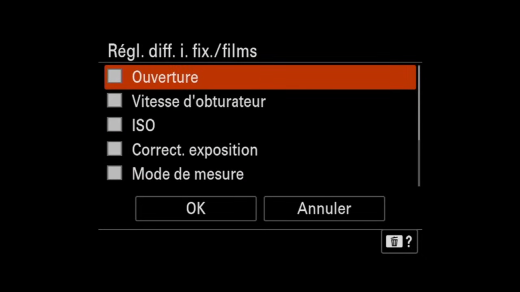 Avant toute chose, je te conseille d’activer l’option Réglage Différent pour Images Fixes et Films. Cela permet de configurer des paramètres distincts pour la photo et la vidéo, ce qui t’offre une plus grande flexibilité selon le type de prise de vue. Par exemple, tu peux choisir des réglages spécifiques pour l’exposition, la balance des blancs, et les ISO en fonction de ton mode de travail.