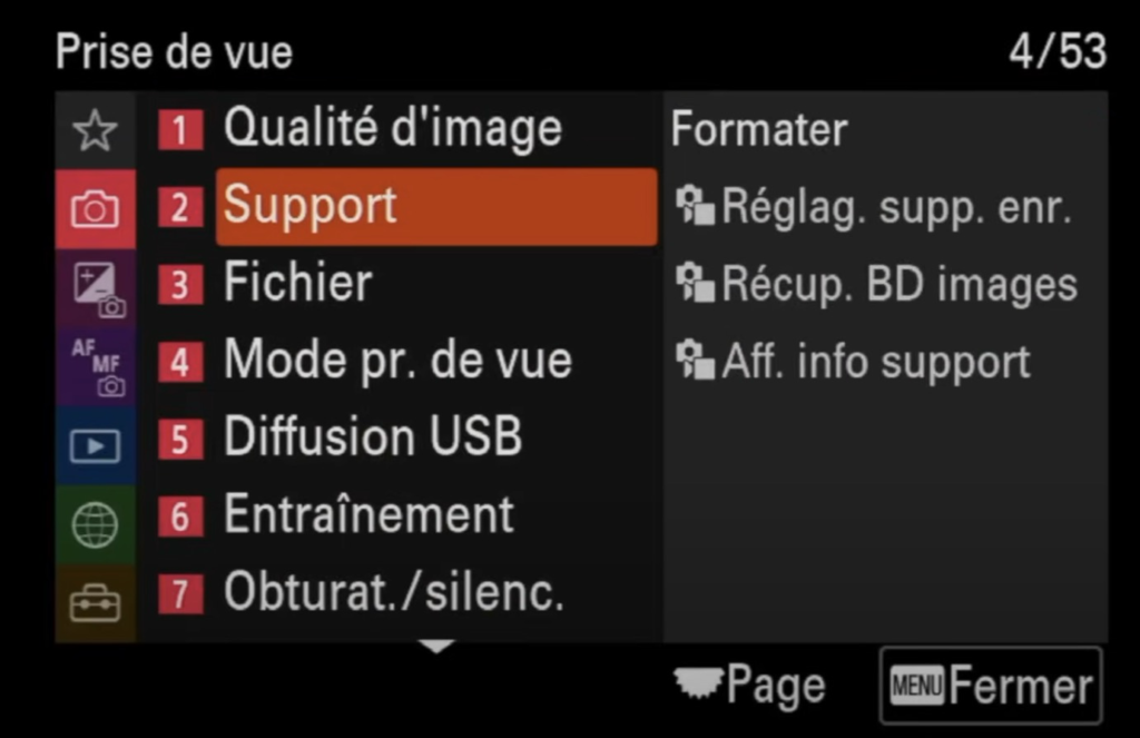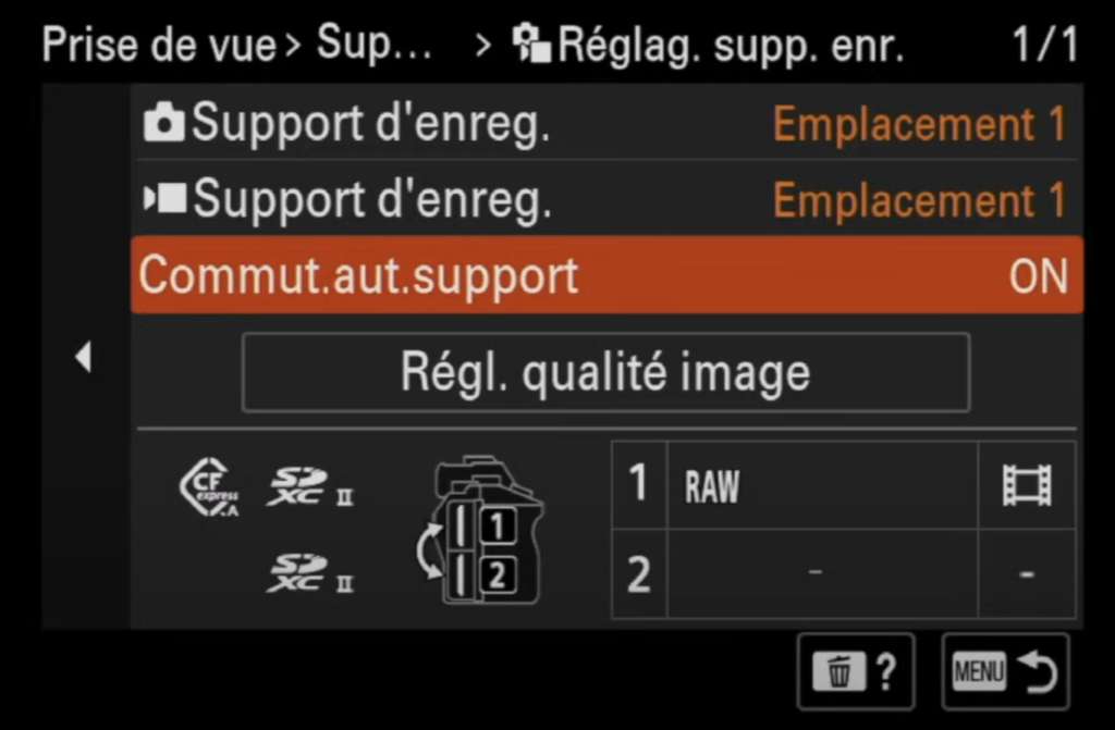 La fonction « Commut. Aut. Support » (Switch auto média) est également très utile. Elle permet à ton appareil de basculer automatiquement sur la deuxième carte mémoire dès que la première est pleine. Je te conseille d’activer cette option (position ON) pour ne jamais te retrouver à court d’espace, surtout lors des prises de vue en rafale ou lors de longues vidéos.
