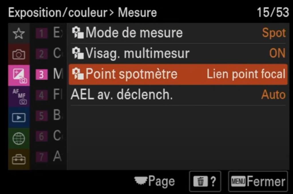 - Sélection viseur/écran : à régler sur auto afin que l’appareil détecte automatique si tu utilises le viseur pour faire une photo ou bien si tu vises avec l’écran arrière.