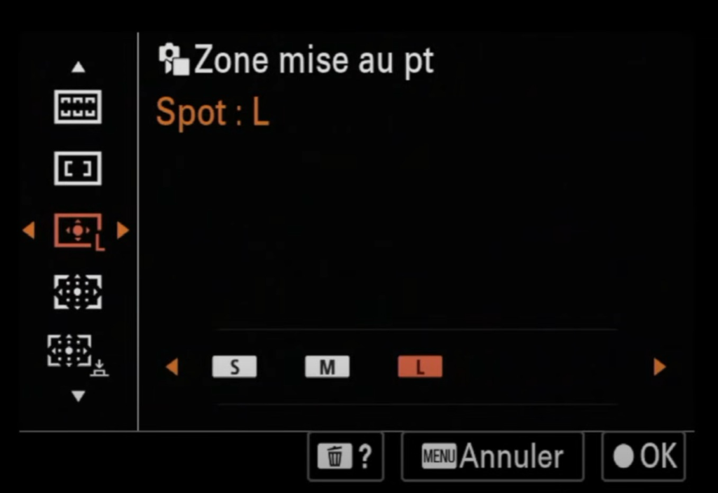 - Zone de mise au point : Permet de choisir entre une zone large ou un suivi précis selon le sujet en mouvement ou la scène.