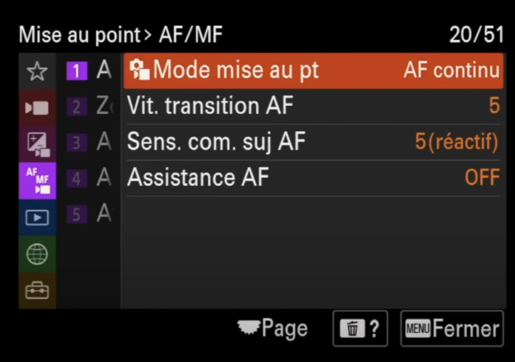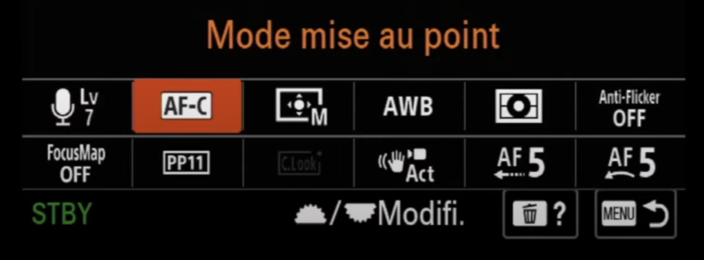 - Mode de mise au point : Comme pour la photographie, je le laisse souvent en mode de mise au point continue (AF-C) pour une transition fluide et rapide.