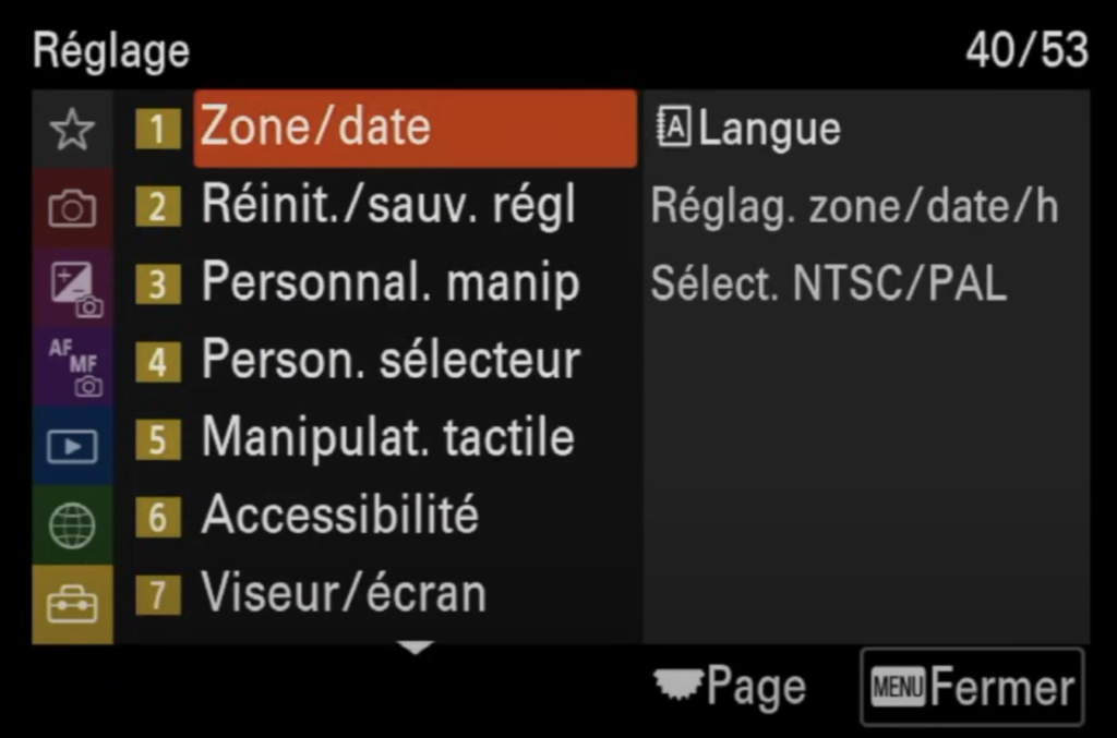 L’onglet Réglage du Sony A7 IV te permet de personnaliser ton appareil pour qu’il réponde parfaitement à tes besoins, que ce soit pour la photo ou la vidéo. Grâce à une multitude d’options, tu peux configurer ton appareil selon tes préférences personnelles.