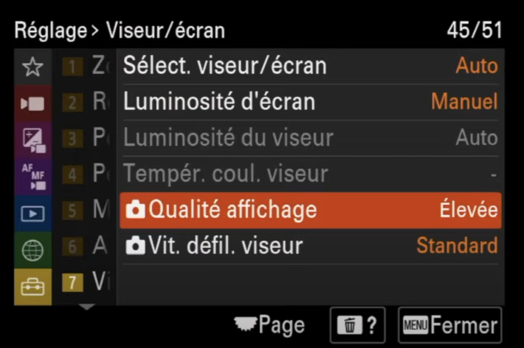 - Luminosité du viseur : je laisse sur auto.