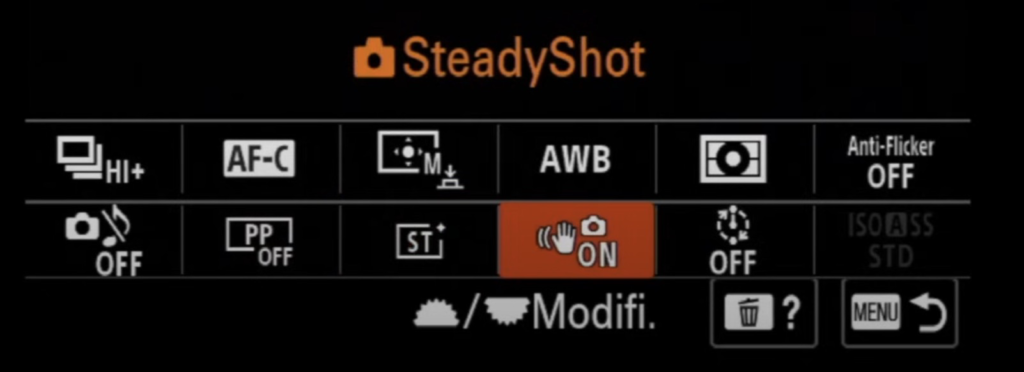 - SteadyShot : Active ou désactive la stabilisation. Cela peut être utile pour la stabilisation vidéo tout en maintenant une certaine fluidité.