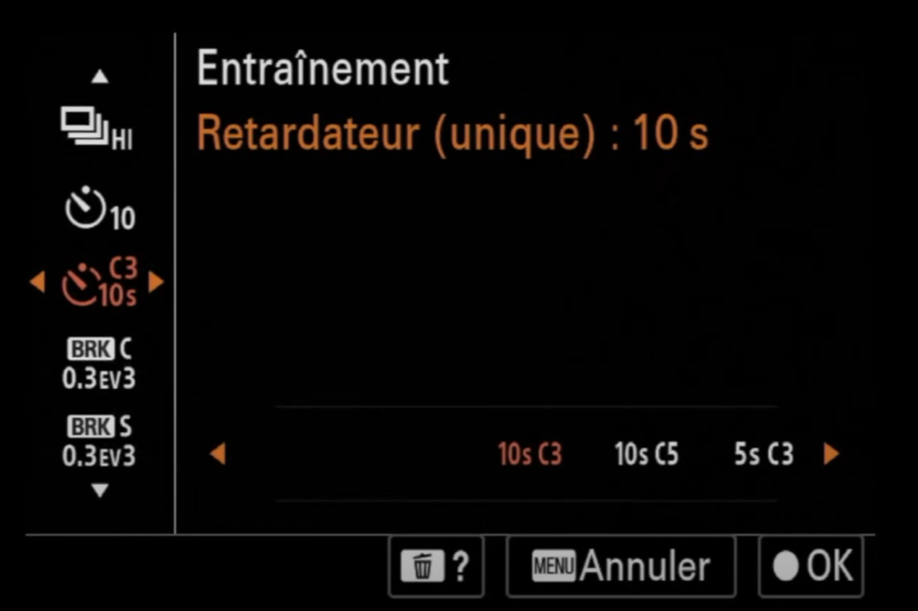 - Prise de Vue Unique / Rafale / Retardateur : Permet de choisir entre une prise de vue unique, une rafale ou un retardateur. Ceci est très utile selon la scène ou le sujet. J’utilise souvent le mode de rafale pour capturer des mouvements rapides.